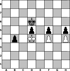 Partie-Notation im PGN-Format [Event "Sweety Tunier"] [Site "www.mySchach.de"] [Date "2006.02.28"] [Round "1"] [White "Falcor"] [Black "Robur"] [ECO "D06"] [WhitemyELO "1422"] [BlackmyELO "1721"] [Result "0-1"] [TimeControl "10/2592000"] [WhiteDays "114"] [BlackDays "096"] [MySchachNr "22944"] 1. d4 d5 2. c4 Nf6 3. Nc3 e6 4. Nf3 Be7 5. Bf4 dxc4 6. e3 Nd5 7. Nxd5 exd5 8. Be2 O-O 9. O-O Bf5 10. h3 Nd7 11. Rc1 Re8 12. Re1 Bb4 13. Rf1 Nf6 14. b3 Ba3 15. Rc2 Bxc2 16. Qxc2 b5 17. Ng5 h6 18. Nf3 Bd6 19. Bxd6 Qxd6 20. Ne5 c5 21. Nf3 cxb3 22. Qxb3 c4 23. Qc2 a5 24. Ne5 Ne4 25. f3 Ng3 26. Bd1 Nxf1 27. Kxf1 Rxe5 28. dxe5 Qxe5 29. f4 Qxe3 30. Qf5 Qd3+ 31. Qxd3 cxd3 32. Ke1 Re8+ 33. Kd2 Re2+ 34. Bxe2 dxe2 35. Kxe2 f5 36. Kd3 Kf7 37. Kd4 Ke6 38. g3 Kd6 39. g4 g6 40. gxf5 gxf5 41. h4 h5 42. a3 b4 43. axb4 axb4 0-1 Stellungs-Notation im FEN-Format 8/8/3k4/3p1p1p/1p1K1P1P/8/8/8 - - - 0 44 Geschlagene Figuren Weiss: Geschlagene Figuren Schwarz: Klicken Sie auf eine geschlagene Figur um den gewünschten Zug darzustellen!