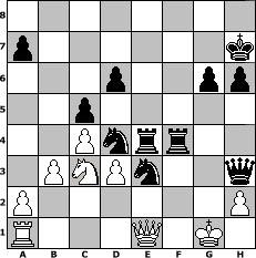 Partie-Notation im PGN-Format [Event "Trotz Sturm und Regen die Figuren bewegen II"] [Site "www.mySchach.de"] [Date "2025.08.15"] [Round "1"] [White "Hobbykegler"] [Black "Grubengeist"] [ECO "B07"] [WhitemyELO "1016"] [BlackmyELO "2167"] [Result "0-1"] [TimeControl "10/2592000"] [WhiteDays "46"] [BlackDays "90"] [MySchachNr "133598"] 1. e4 d6 2. Nf3 c5 3. c4 e5 4. Be2 Nc6 5. Nc3 g6 6. O-O Bg7 7. d3 Nge7 8. Be3 O-O 9. Ng5 h6 10. Nh3 Kh7 11. f4 Bxh3 12. gxh3 f5 13. exf5 Nxf5 14. Bf2 exf4 15. Bf3 Bd4 16. Bxd4 Ncxd4 17. Be4 Qh4 18. Bxb7 Rae8 19. Be4 Ne3 20. Qe1 Qxh3 21. Rxf4 Rxf4 22. b3 Rexe4 0-1 Stellungs-Notation im FEN-Format 8/p6k/3p2pp/2p5/2Pnrr2/1PNPn2q/P6P/R3Q1K1 - - - 0 23 Geschlagene Figuren Weiss: ![]() ![]() ![]() ![]() ![]() ![]() ![]() ![]() ![]() ![]() ![]() ![]() ![]() ![]() ![]() Geschlagene Figuren Schwarz: ![]() ![]() ![]() ![]() ![]() ![]() ![]() ![]() ![]() ![]() ![]() ![]() ![]() ![]() ![]() Klicken Sie auf eine geschlagene Figur um den gewünschten Zug darzustellen!
