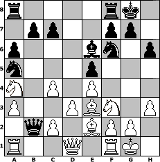 Partie-Notation im PGN-Format [Event "Herbstturnier 2022"] [Site "www.mySchach.de"] [Date "2022.09.26"] [Round "2"] [White "Leon"] [Black "MiFie"] [ECO "A22"] [WhitemyELO "1632"] [BlackmyELO "1087"] [Result "1-0"] [TimeControl "10/1728000"] [WhiteDays "40"] [BlackDays "29"] [MySchachNr "127288"] 1. c4 e5 2. Nc3 Nf6 3. e4 Nc6 4. Nf3 Bc5 5. h3 O-O 6. d3 h6 7. a3 d6 8. b4 Be6 9. bxc5 a6 10. cxd6 Qxd6 11. Be2 Na5 12. O-O Qb6 13. Be3 Qb2 14. Na4 1-0 Stellungs-Notation im FEN-Format r4rk1/1pp2pp1/p3bn1p/n3p3/N1P1P3/P2PBN1P/1qP1BPP1/R2Q1RK1 - - - 7 14 Geschlagene Figuren Weiss: Geschlagene Figuren Schwarz: Klicken Sie auf eine geschlagene Figur um den gewünschten Zug darzustellen!