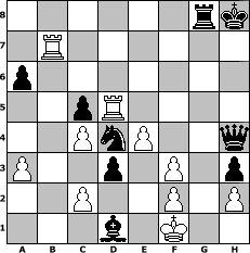 Partie-Notation im PGN-Format [Event "1. Weltmeisterschaft @ myschach.de"] [Site "www.mySchach.de"] [Date "2006.09.15"] [Round "1"] [White "bane"] [Black "HPB2005"] [ECO "A20"] [WhitemyELO "1933"] [BlackmyELO "1988"] [Result "0-1"] [TimeControl "10/2592000"] [WhiteDays "112"] [BlackDays "079"] [MySchachNr "28467"] 1. c4 e5 2. e4 g6 3. Nf3 Bg7 4. d4 exd4 5. Bg5 f6 6. Bf4 c5 7. Nbd2 d6 8. Bd3 Nh6 9. Qa4+ Nc6 10. a3 Ng4 11. Qb5 O-O 12. O-O Nge5 13. Nxe5 fxe5 14. Bg3 h5 15. Nf3 Rxf3 16. gxf3 Qf6 17. Kg2 h4 18. Be2 d3 19. Bd1 Nd4 20. Qe8+ Kh7 21. Qa4 Qd8 22. b4 a6 23. Rh1 h3+ 24. Kf1 g5 25. Bxe5 Bxe5 26. bxc5 dxc5 27. Rg1 Bd7 28. Rxg5 Bxa4 29. Rxe5 Qh4 30. Rd5 Rg8 31. Rb1 Kh8 32. Rxb7 Bxd1 0-1 Stellungs-Notation im FEN-Format 6rk/1R6/p7/2pR4/2PnP2q/P2p1P1p/2P2P1P/3b1K2 - - - 0 33 Geschlagene Figuren Weiss: ![]() ![]() ![]() ![]() ![]() ![]() ![]() ![]() ![]() ![]() ![]() ![]() ![]() ![]() ![]() Geschlagene Figuren Schwarz: ![]() ![]() ![]() ![]() ![]() ![]() ![]() ![]() ![]() ![]() ![]() ![]() ![]() ![]() ![]() Klicken Sie auf eine geschlagene Figur um den gewünschten Zug darzustellen!