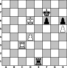 Partie-Notation im PGN-Format [Event "Turnier zum Winterende"] [Site "www.mySchach.de"] [Date "2006.02.18"] [Round "2"] [White "Look"] [Black "lupus56"] [ECO "C15"] [WhitemyELO "1805"] [BlackmyELO "1527"] [Result "1/2-1/2"] [TimeControl "10/2592000"] [WhiteDays "166"] [BlackDays "150"] [MySchachNr "22642"] 1. e4 e6 2. d4 d5 3. Nc3 Bb4 4. exd5 exd5 5. Bd2 Nf6 6. Bg5 O-O 7. Bd3 c5 8. a3 Bxc3+ 9. bxc3 Re8+ 10. Be2 Nc6 11. Nf3 h6 12. Bxf6 Qxf6 13. O-O Re7 14. Qd2 c4 15. Bd1 Bd7 16. Re1 Rae8 17. Rxe7 Rxe7 18. h3 Qg6 19. Nh4 Qe4 20. g4 Qe6 21. Ng2 Qf6 22. f3 Nd8 23. Nf4 Qg5 24. Kg2 b5 25. Kg3 Ne6 26. h4 Qxf4+ 27. Qxf4 Nxf4 28. Kxf4 a6 29. Kg3 f5 30. gxf5 Bxf5 31. Kf2 Kf7 32. f4 Kf6 33. a4 Be4 34. axb5 axb5 35. Ra5 Rb7 36. Ra6+ Kf7 37. Bf3 Bxf3 38. Kxf3 b4 39. cxb4 Rxb4 40. Ra7+ Kf6 41. Rd7 Rb5 42. h5 Ra5 43. c3 Rb5 44. Kg4 Ra5 45. f5 Rb5 46. Kf4 Rb3 47. Rxd5 Rxc3 48. Rc5 Rc1 49. Rc6+ Kf7 50. Ke5 c3 51. Rc7+ Kf8 52. f6 Re1+ 53. Kd6 gxf6 54. Rxc3 Kf7 1/2-1/2 Stellungs-Notation im FEN-Format 8/5k2/3K1p1p/7P/3P4/2R5/8/4r3 - - - 1 55 Geschlagene Figuren Weiss: Geschlagene Figuren Schwarz: Klicken Sie auf eine geschlagene Figur um den gewünschten Zug darzustellen!