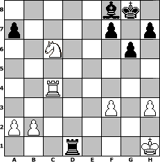 Partie-Notation im PGN-Format [Event "Turnier zum 80.Geburtstag von Viktor Kortschnoi"] [Site "www.mySchach.de"] [Date "2011.03.22"] [Round "1"] [White "woern63"] [Black "deepsabel"] [ECO "C45"] [WhitemyELO "1880"] [BlackmyELO "1966"] [Result "0-1"] [TimeControl "10/2592000"] [WhiteDays "116"] [BlackDays "117"] [MySchachNr "72995"] 1. e4 e5 2. Nf3 Nc6 3. d4 exd4 4. Nxd4 Nf6 5. Nxc6 bxc6 6. Nc3 Bb4 7. Bd3 d5 8. exd5 cxd5 9. Qe2+ Be7 10. O-O O-O 11. Nb5 c6 12. Nd4 Qc7 13. c4 Re8 14. Qc2 Bd6 15. h3 Ba6 16. Be3 g6 17. cxd5 Bxd3 18. Qxd3 Nxd5 19. Rac1 Nxe3 20. fxe3 Rad8 21. Qc3 Qb6 22. Qc4 Re7 23. Nxc6 Rc7 24. Kh1 Rdc8 25. Qd5 Bf8 26. Rf6 Qxe3 27. Rc4 Re8 28. Rf1 Re6 29. Na5 Qe2 30. Rfc1 Rd6 31. Qf3 Qxf3 32. gxf3 Rcd7 33. Nc6 Rd1+ 34. Rxd1 Rxd1+ 0-1 Stellungs-Notation im FEN-Format 5bk1/p4p1p/2N3p1/8/2R5/5P1P/PP6/3r3K - - - 0 35 Geschlagene Figuren Weiss: Geschlagene Figuren Schwarz: Klicken Sie auf eine geschlagene Figur um den gewünschten Zug darzustellen!