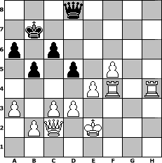 Partie-Notation im PGN-Format [Event "Sweety Tunier"] [Site "www.mySchach.de"] [Date "2006.02.28"] [Round "1"] [White "AlbertoAveiro"] [Black "Falcor"] [ECO "C62"] [WhitemyELO "1517"] [BlackmyELO "1422"] [Result "1-0"] [TimeControl "10/2592000"] [WhiteDays "18"] [BlackDays "93"] [MySchachNr "22926"] 1. e4 e5 2. Nf3 Nc6 3. Bb5 d6 4. O-O Nf6 5. d3 Bd7 6. c3 a6 7. Ba4 h6 8. h3 g5 9. Be3 g4 10. hxg4 Bxg4 11. Nbd2 Be7 12. Qc2 b5 13. Bb3 h5 14. Ng5 h4 15. Nxf7 Qd7 16. Nxh8 O-O-O 17. Ng6 Rg8 18. Bxg8 Nxg8 19. Nxe7+ Qxe7 20. f3 Bh5 21. Kf2 Qg7 22. Rg1 Qg3+ 23. Ke2 Nce7 24. Raf1 d5 25. Bf2 Qg5 26. g4 Bf7 27. Rh1 Ng6 28. Be3 Qe7 29. Nb3 Nf6 30. Bg5 Nf4+ 31. Bxf4 exf4 32. Nd4 Kb7 33. a3 c6 34. Rxh4 Nxe4 35. Nf5 Qd8 36. fxe4 Bg6 37. Rxf4 Bxf5 38. gxf5 1-0 Stellungs-Notation im FEN-Format 3q4/1k6/p1p5/1p1p1P2/4PR1R/P1PP4/1PQ1K3/8 - - - 0 38 Geschlagene Figuren Weiss: Geschlagene Figuren Schwarz: Klicken Sie auf eine geschlagene Figur um den gewünschten Zug darzustellen!