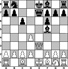 Partie-Notation im PGN-Format [Event "Einstand"] [Site "www.mySchach.de"] [Date "2010.12.10"] [Round "2"] [White "Haki"] [Black "Master1"] [ECO "D00"] [WhitemyELO "1315"] [BlackmyELO "1328"] [Result "0-1"] [TimeControl "10/864000"] [WhiteDays "10"] [BlackDays "08"] [MySchachNr "70498"] 1. d4 d5 2. e4 c6 3. Nc3 dxe4 4. Nxe4 Bf5 5. Qd3 Nf6 6. Nxf6+ exf6 7. Qe3+ Qe7 0-1 Stellungs-Notation im FEN-Format rn2kb1r/pp2qppp/2p2p2/5b2/3P4/4Q3/PPPP1PPP/R1B1KBNR - KQkq - 2 8 Geschlagene Figuren Weiss: Geschlagene Figuren Schwarz: Klicken Sie auf eine geschlagene Figur um den gewünschten Zug darzustellen!