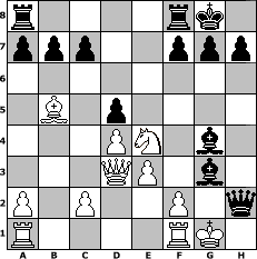 Partie-Notation im PGN-Format [Event "< 1500 Nr. 2"] [Site "www.mySchach.de"] [Date "2010.04.07"] [Round "1"] [White "Haki"] [Black "Knight"] [ECO "A00"] [WhitemyELO "1287"] [BlackmyELO "1132"] [Result "0-1"] [TimeControl "10/2592000"] [WhiteDays "30"] [BlackDays "29"] [MySchachNr "64579"] 1. b4 e5 2. Bb2 Bxb4 3. Bxe5 Nf6 4. e3 d5 5. Nf3 Bg4 6. Be2 Nc6 7. Bb5 O-O 8. O-O Nxe5 9. d4 Nxf3+ 10. Kh1 Nxh2 11. Kxh2 Qd6+ 12. g3 Ne4 13. Qd3 Qh6+ 14. Kg1 Bd6 15. Nd2 Bxg3 16. Nxe4 Qh2# 0-1 Stellungs-Notation im FEN-Format r4rk1/ppp2ppp/8/1B1p4/3PN1b1/3QP1b1/P1P2P1q/R4RK1 - - - 1 17 Geschlagene Figuren Weiss: Geschlagene Figuren Schwarz: Klicken Sie auf eine geschlagene Figur um den gewünschten Zug darzustellen!