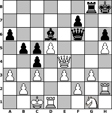 Partie-Notation im PGN-Format [Event "Bitte nur Fair und ohne KI Hilfe"] [Site "www.mySchach.de"] [Date "2019.02.03"] [Round "1"] [White "Achimkogge"] [Black "MiFie"] [ECO "D00"] [WhitemyELO "1422"] [BlackmyELO "1107"] [Result "1-0"] [TimeControl "10/2592000"] [WhiteDays "117"] [BlackDays "111"] [MySchachNr "114254"] 1. d4 d5 2. c3 Nc6 3. h3 e6 4. Nf3 Bd6 5. Bg5 Nf6 6. Nbd2 h6 7. Bxf6 Qxf6 8. e3 O-O 9. Bd3 a6 10. Qc2 Bd7 11. Bh7+ Kh8 12. Bd3 e5 13. Be2 e4 14. Ng1 Rae8 15. h4 Re6 16. Nf1 g5 17. Bg4 Re7 18. Bxd7 Rxd7 19. h5 g4 20. g3 Na5 21. O-O-O Nc4 22. Qe2 c5 23. Qxg4 Rg8 24. Qxd7 Rb8 25. Rh2 Nb6 26. Qg4 Nc4 27. Nd2 Rg8 28. Qd7 Rb8 29. Nxc4 dxc4 30. d5 b5 31. a3 Rd8 32. Qg4 Rg8 33. Qxe4 1-0 Stellungs-Notation im FEN-Format 6rk/5p2/p2b1q1p/1ppP3P/2p1Q3/P1P1P1P1/1P3P1R/2KR2N1 - - - 0 33 Geschlagene Figuren Weiss: Geschlagene Figuren Schwarz: Klicken Sie auf eine geschlagene Figur um den gewünschten Zug darzustellen!