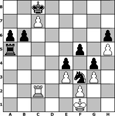 Partie-Notation im PGN-Format [Event "Valkyrenritt"] [Site "www.mySchach.de"] [Date "2021.02.22"] [Round "1"] [White "Hobbykegler"] [Black "lotchi"] [ECO "A20"] [WhitemyELO "997"] [BlackmyELO "1291"] [Result "0-1"] [TimeControl "10/864000"] [WhiteDays "25"] [BlackDays "50"] [MySchachNr "121297"] 1. c4 e5 2. b3 f5 3. Bb2 Nc6 4. Qc2 g6 5. Nc3 Bg7 6. Nd5 d6 7. g3 Nf6 8. Nxf6+ Bxf6 9. h4 e4 10. Bxf6 Qxf6 11. Rd1 Be6 12. Nh3 O-O-O 13. e3 Ne5 14. Ng5 h6 15. Nxe6 Qxe6 16. c5 Qe7 17. cxd6 Rxd6 18. Rc1 c6 19. a4 a6 20. h5 g5 21. b4 Rhd8 22. Be2 Rxd2 23. Qc3 Nf3+ 24. Kf1 g4 25. Kg2 Rxe2 26. Rhd1 Red2 27. Rf1 R2d3 28. Qc2 Rd2 29. Qc3 Qe5 30. Qc4 Kb8 31. b5 Qd5 32. Qc3 Qd3 33. Qxd3 R2xd3 34. bxc6 R8d6 35. c7+ Kc8 36. Rc5 Rc6 37. Rfc1 Rxc5 38. Rxc5 Ra3 39. a5 Rb3 40. Kf1 Rb5 41. Rc1 Rxa5 42. Rc2 b6 0-1 Stellungs-Notation im FEN-Format 2k5/2P5/pp5p/r4p1P/4p1p1/4PnP1/2R2P2/5K2 - - - 0 43 Geschlagene Figuren Weiss: Geschlagene Figuren Schwarz: Klicken Sie auf eine geschlagene Figur um den gewünschten Zug darzustellen!