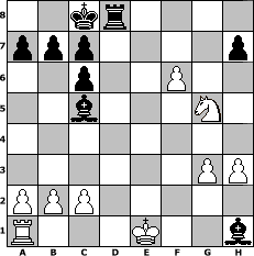Partie-Notation im PGN-Format [Event "Fernschachmeisterschaft Sfr. Heimersheim 2004"] [Site "www.mySchach.de"] [Date "2004.03.16"] [Round "1"] [White "miu"] [Black "paula"] [ECO "C63"] [WhitemyELO "1500"] [BlackmyELO "1500"] [Result "0-1"] [TimeControl "10/2592000"] [WhiteDays "42"] [BlackDays "57"] [MySchachNr "3058"] 1. e4 e5 2. Nf3 Nc6 3. Bb5 f5 4. Nc3 Nf6 5. Bxc6 dxc6 6. Qe2 fxe4 7. Nxe4 Bg4 8. Nxf6+ gxf6 9. h3 Be6 10. d4 Rg8 11. Bf4 Qd5 12. dxe5 O-O-O 13. exf6 Bc5 14. Qe5 Qxe5+ 15. Bxe5 Rxg2 16. Bg3 Bd5 17. Ng5 Rxg3 18. fxg3 Bxh1 0-1 Stellungs-Notation im FEN-Format 2kr4/ppp4p/2p2P2/2b3N1/8/6PP/PPP5/R3K2b - KQ - 0 19 Geschlagene Figuren Weiss: ![]() ![]() ![]() ![]() ![]() ![]() ![]() ![]() ![]() ![]() ![]() ![]() ![]() ![]() ![]() Geschlagene Figuren Schwarz: ![]() ![]() ![]() ![]() ![]() ![]() ![]() ![]() ![]() ![]() ![]() ![]() ![]() ![]() ![]() Klicken Sie auf eine geschlagene Figur um den gewünschten Zug darzustellen!