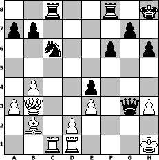 Partie-Notation im PGN-Format [Event "?"] [Site "www.mySchach.de"] [Date "2025.07.23"] [Round "?"] [White "peter58"] [Black "Jonas84"] [ECO "A40"] [WhitemyELO "1517"] [BlackmyELO "1508"] [Result "0-1"] [TimeControl "10/864000"] [WhiteDays "29"] [BlackDays "40"] [MySchachNr "133537"] 1. d4 e6 2. c4 c5 3. Nf3 d5 4. Nc3 h6 5. e3 Nf6 6. Bd3 Nc6 7. cxd5 exd5 8. dxc5 Bxc5 9. O-O O-O 10. a3 Bg4 11. b4 Bb6 12. Be2 Be6 13. Qc2 Bc7 14. Rd1 Qd6 15. g3 Bh3 16. Bf1 Bg4 17. Bg2 Rad8 18. h3 Bh5 19. Nb5 Qd7 20. Nxc7 Qxc7 21. Bb2 Ne4 22. Be5 Qc8 23. Kh2 Bxf3 24. Bxf3 Qf5 25. Bxe4 dxe4 26. Bb2 Rc8 27. Qc3 f6 28. Qb3+ Kh8 29. Rac1 Qxf2+ 30. Kh1 Qxg3 0-1 Stellungs-Notation im FEN-Format 2r2r1k/pp4p1/2n2p1p/8/1P2p3/PQ2P1qP/1B1P4/2RR3K - - - 0 31 Geschlagene Figuren Weiss: Geschlagene Figuren Schwarz: Klicken Sie auf eine geschlagene Figur um den gewünschten Zug darzustellen!