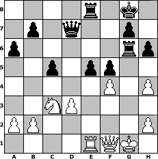Partie-Notation im PGN-Format [Event "Vereinsmeisterschaft"] [Site "www.mySchach.de"] [Date "2006.08.24"] [Round "2"] [White "Jens1943"] [Black "Juliette2103"] [ECO "C42"] [WhitemyELO "1453"] [BlackmyELO "1642"] [Result "0-1"] [TimeControl "10/2592000"] [WhiteDays "86"] [BlackDays "28"] [MySchachNr "27964"] 1. e4 e5 2. Nf3 Nf6 3. Bc4 Nc6 4. Qe2 Bc5 5. c3 O-O 6. O-O d6 7. Re1 Be6 8. Bd5 Bxd5 9. exd5 Nxd5 10. d3 Re8 11. Nbd2 Nf4 12. Qf1 Ne7 13. Ne4 Bb6 14. Nfg5 Neg6 15. Bxf4 Nxf4 16. g3 Ne6 17. Rad1 h6 18. Nxe6 Rxe6 19. c4 d5 20. cxd5 Qxd5 21. Nc3 Qd7 22. Re4 Rae8 23. Rde1 f5 24. Rb4 c5 25. Ra4 a6 26. Rh4 Bd8 27. f4 Bxh4 28. gxh4 Rg6+ 0-1 Stellungs-Notation im FEN-Format 4r1k1/1p1q2p1/p5rp/2p1pp2/5P1P/2NP4/PP5P/4RQK1 - - - 1 29 Geschlagene Figuren Weiss: Geschlagene Figuren Schwarz: Klicken Sie auf eine geschlagene Figur um den gewünschten Zug darzustellen!