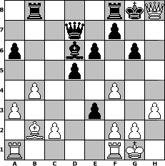 Partie-Notation im PGN-Format [Event "Winterende2014"] [Site "www.mySchach.de"] [Date "2014.03.06"] [Round "2"] [White "muellerh"] [Black "MiFie"] [ECO "A03"] [WhitemyELO "1532"] [BlackmyELO "1043"] [Result "1-0"] [TimeControl "10/1728000"] [WhiteDays "53"] [BlackDays "58"] [MySchachNr "93435"] 1. f4 d5 2. d4 Nc6 3. Nf3 Bf5 4. e3 Nf6 5. Bb5 a6 6. Bxc6+ bxc6 7. Nc3 e6 8. O-O Bd6 9. Ne5 O-O 10. Nxc6 Qd7 11. Ne5 Qe8 12. a3 h6 13. h3 Nh5 14. Qxh5 g6 15. Qxh6 c6 16. e4 Bxe4 17. Nxe4 dxe4 18. b4 Rb8 19. Bb2 e3 20. d5 cxd5 21. Nd7 Qxd7 22. Qh8# 1-0 Stellungs-Notation im FEN-Format 1r3rkQ/3q1p2/p2bp1p1/3p4/1P3P2/P3p2P/1BP2PP1/R4RK1 - - - 1 22 Geschlagene Figuren Weiss: Geschlagene Figuren Schwarz: Klicken Sie auf eine geschlagene Figur um den gewünschten Zug darzustellen!