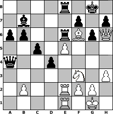 Partie-Notation im PGN-Format [Event "Schach dem" Nikolaus""] [Site "www.mySchach.de"] [Date "2009.11.28"] [Round "1"] [White "Caligula"] [Black "Winston"] [ECO "D02"] [WhitemyELO "1420"] [BlackmyELO "1399"] [Result "1-0"] [TimeControl "10/2592000"] [WhiteDays "120"] [BlackDays "120"] [MySchachNr "60970"] 1. d4 d5 2. Nf3 e6 3. e3 Nf6 4. c4 dxc4 5. Bxc4 a6 6. a4 Nc6 7. O-O Be7 8. Nc3 Bb4 9. Bd2 Na5 10. Bd3 Nb3 11. Qxb3 Bd6 12. e4 Be7 13. h3 b6 14. e5 Nd7 15. d5 Nc5 16. Qc4 Nxd3 17. Qxd3 Bb7 18. Rfe1 exd5 19. Ne2 O-O 20. Ned4 c5 21. Nf5 Rc8 22. Nxe7+ Qxe7 23. Ng5 g6 24. Nf3 Rfe8 25. Bg5 Qd7 26. Re2 Re6 27. Bf6 Rce8 28. Rae1 Qxa4 29. Qd2 d4 30. Qh6 1-0 Stellungs-Notation im FEN-Format 4r1k1/1b3p1p/pp2rBpQ/2p1P3/q2p4/5N1P/1P2RPP1/4R1K1 - - - 1 30 Geschlagene Figuren Weiss: Geschlagene Figuren Schwarz: Klicken Sie auf eine geschlagene Figur um den gewünschten Zug darzustellen!