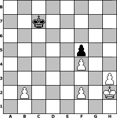 Partie-Notation im PGN-Format [Event "Eine Chance f"] [Site "www.mySchach.de"] [Date "2008.08.01"] [Round "2"] [White "rux"] [Black "Master1"] [ECO "D06"] [WhitemyELO "1424"] [BlackmyELO "1261"] [Result "1-0"] [TimeControl "10/1728000"] [WhiteDays "20"] [BlackDays "20"] [MySchachNr "46776"] 1. d4 d5 2. c4 Nf6 3. Nc3 e6 4. a3 Be7 5. e3 Nc6 6. c5 e5 7. Bb5 Bd7 8. Ba4 exd4 9. exd4 O-O 10. Nf3 a6 11. O-O b5 12. Bb3 Bg4 13. Qd3 b4 14. Ne2 Bxf3 15. Qxf3 a5 16. axb4 axb4 17. Rxa8 Qxa8 18. Bxd5 Nxd5 19. Qxd5 Na5 20. Qd7 Qd8 21. Qa4 c6 22. Qxb4 Re8 23. Bd2 Bxc5 24. Qxc5 Nb3 25. Qc3 Nxd2 26. Qxd2 c5 27. d5 h6 28. Rc1 Qd6 29. Ng3 Re5 30. Qc2 Rxd5 31. Ne4 Qc7 32. Nxc5 g6 33. h3 f5 34. Qc4 Qd6 35. Nd3 Kg7 36. Qc3+ Kf7 37. Rd1 Ke7 38. g3 h5 39. Qg7+ Kd8 40. Qc3 g5 41. Qh8+ Kc7 42. Qxh5 Rxd3 43. Rxd3 Qxd3 44. Qxg5 Qd1+ 45. Kh2 Qf3 46. Qf4+ Qxf4 47. gxf4 1-0 Stellungs-Notation im FEN-Format 8/2k5/8/5p2/5P2/7P/1P3P1K/8 - - - 0 47 Geschlagene Figuren Weiss: Geschlagene Figuren Schwarz: Klicken Sie auf eine geschlagene Figur um den gewünschten Zug darzustellen!
