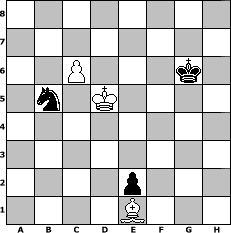 Partie-Notation im PGN-Format [Event "Orang - Utan"] [Site "www.mySchach.de"] [Date "2012.03.06"] [Round "1"] [White "Seneca"] [Black "Andylein1989"] [ECO "A00"] [WhitemyELO "1339"] [BlackmyELO "1562"] [Result "1/2-1/2"] [TimeControl "10/2592000"] [WhiteDays "133"] [BlackDays "107"] [MySchachNr "80351"] 1. b4 Nf6 2. Nf3 e6 3. a3 Be7 4. g3 O-O 5. Bg2 a6 6. O-O d5 7. e3 c5 8. bxc5 Bxc5 9. d4 Bd6 10. Bb2 Nc6 11. Nbd2 b5 12. Nb3 Re8 13. c3 Bb7 14. a4 h6 15. Qe2 bxa4 16. Rxa4 Qb6 17. Nfd2 Rec8 18. Rb1 Ne7 19. Na5 Bc6 20. Nxc6 Rxc6 21. c4 Qa7 22. c5 Bc7 23. Bc3 Nf5 24. e4 Ne7 25. Kh1 Bd8 26. e5 Nh7 27. Bf1 Ng6 28. Rba1 Ng5 29. Rxa6 Rxa6 30. Rxa6 Qxa6 31. Qxa6 Rxa6 32. Bxa6 f6 33. exf6 gxf6 34. Bd3 Kf7 35. Kg2 Bc7 36. f4 Nh7 37. Bxg6+ Kxg6 38. Kf3 Nf8 39. h4 h5 40. Nb3 Kf7 41. Ba5 Bb8 42. Bb6 Ke8 43. Na5 Nd7 44. Nc6 e5 45. fxe5 fxe5 46. Nxb8 e4+ 47. Ke3 Nxb8 48. Ba5 Nc6 49. Bd2 Kf7 50. Bc3 Kf6 51. Kf4 Kg6 52. g4 hxg4 53. Kxg4 Kh6 54. h5 e3 55. Kf5 e2 56. Ke6 Nxd4+ 57. Kxd5 Nb5 58. Be1 Kxh5 59. c6 Kg6 1/2-1/2 Stellungs-Notation im FEN-Format 8/8/2P3k1/1n1K4/8/8/4p3/4B3 - - - 1 60 Geschlagene Figuren Weiss: Geschlagene Figuren Schwarz: Klicken Sie auf eine geschlagene Figur um den gewünschten Zug darzustellen!