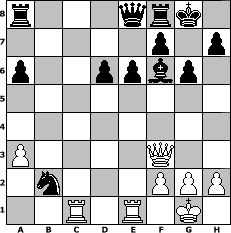 Partie-Notation im PGN-Format [Event "Der sizillianische Drachen"] [Site "www.mySchach.de"] [Date "2004.06.23"] [Round "2"] [White "MaxPayne"] [Black "Joschi"] [ECO "B70"] [WhitemyELO "1493"] [BlackmyELO "1600"] [Result "0-1"] [TimeControl "10/3456000"] [WhiteDays "097"] [BlackDays "113"] [MySchachNr "5345"] 1. e4 c5 2. Nf3 d6 3. d4 cxd4 4. Nxd4 Nf6 5. Nc3 g6 6. Be2 Bg7 7. O-O O-O 8. Bg5 Nbd7 9. Qd2 a6 10. Rfd1 b5 11. Nc6 Qe8 12. a3 Bb7 13. Nd4 Nxe4 14. Nxe4 Bxe4 15. c4 bxc4 16. Bxc4 Nb6 17. Rac1 Nxc4 18. Qf4 Bd5 19. Nf3 Bxf3 20. Qxf3 Nxb2 21. Re1 e6 22. Bf6 Bxf6 0-1 Stellungs-Notation im FEN-Format r3qrk1/5p1p/p2ppbp1/8/8/P4Q2/1n3PPP/2R1R1K1 - - - 0 23 Geschlagene Figuren Weiss: Geschlagene Figuren Schwarz: Klicken Sie auf eine geschlagene Figur um den gewünschten Zug darzustellen!