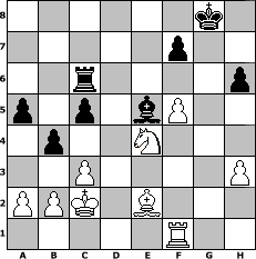 Partie-Notation im PGN-Format [Event "Winterspiele"] [Site "www.mySchach.de"] [Date "2008.12.29"] [Round "1"] [White "Zoidberg"] [Black "Juliette2103"] [ECO "D00"] [WhitemyELO "1825"] [BlackmyELO "1461"] [Result "1-0"] [TimeControl "10/864000"] [WhiteDays "35"] [BlackDays "00"] [MySchachNr "51073"] 1. d4 d5 2. e4 dxe4 3. Nc3 Nf6 4. f3 e5 5. dxe5 Qxd1+ 6. Nxd1 Nfd7 7. f4 g5 8. Nf2 gxf4 9. Bxf4 Nc6 10. Nxe4 Ncxe5 11. O-O-O Bg7 12. g3 O-O 13. Bg2 c6 14. Nd6 Ng6 15. Nxc8 Raxc8 16. Rxd7 Nxf4 17. gxf4 Rb8 18. Nh3 Rfe8 19. Bf3 Re3 20. Rf1 a5 21. Kd2 Re6 22. c3 h6 23. Bh5 Rf6 24. f5 c5 25. Ng1 b5 26. Ne2 Rbb6 27. Ng3 Rbd6+ 28. Rxd6 Rxd6+ 29. Kc2 b4 30. Be2 Be5 31. Ne4 Rc6 32. h3 1-0 Stellungs-Notation im FEN-Format 6k1/5p2/2r4p/p1p1bP2/1p2N3/2P4P/PPK1B3/5R2 - - - 0 32 Geschlagene Figuren Weiss: ![]() ![]() ![]() ![]() ![]() ![]() ![]() ![]() ![]() ![]() ![]() ![]() ![]() ![]() ![]() Geschlagene Figuren Schwarz: ![]() ![]() ![]() ![]() ![]() ![]() ![]() ![]() ![]() ![]() ![]() ![]() ![]() ![]() ![]() Klicken Sie auf eine geschlagene Figur um den gewünschten Zug darzustellen!