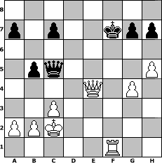 Partie-Notation im PGN-Format [Event "1-2009"] [Site "www.mySchach.de"] [Date "2009.01.01"] [Round "1"] [White "JerryWho"] [Black "steff"] [ECO "D02"] [WhitemyELO "1575"] [BlackmyELO "1207"] [Result "1-0"] [TimeControl "10/1728000"] [WhiteDays "47"] [BlackDays "73"] [MySchachNr "51206"] 1. d4 d5 2. Nf3 Nc6 3. e3 Nf6 4. c3 Bg4 5. Bd3 e6 6. Nbd2 Bd6 7. e4 O-O 8. h3 Bh5 9. Bc2 Bf4 10. g3 Bh6 11. e5 Nd7 12. g4 Bg6 13. h4 Bf4 14. h5 Bxc2 15. Qxc2 b5 16. Ng1 f6 17. Nh3 fxe5 18. Nxf4 exf4 19. Nf3 e5 20. dxe5 Ncxe5 21. Nxe5 Nxe5 22. Bd2 Nf3+ 23. Kd1 Re8 24. Kc1 Re2 25. Qd1 Rxf2 26. Bxf4 Qf6 27. Qxd5+ Kf8 28. Qxa8+ Ke7 29. Be3 Re2 30. Bc5+ Kd7 31. Rd1+ Nd2 32. Rxd2+ Rxd2 33. Kxd2 Qg5+ 34. Kc2 Qxc5 35. Rd1+ Ke7 36. Qe4+ Kf7 37. Rf1+ 1-0 Stellungs-Notation im FEN-Format 8/p1p2kpp/8/1pq4P/4Q1P1/2P5/PPK5/5R2 - - - 5 37 Geschlagene Figuren Weiss: Geschlagene Figuren Schwarz: Klicken Sie auf eine geschlagene Figur um den gewünschten Zug darzustellen!