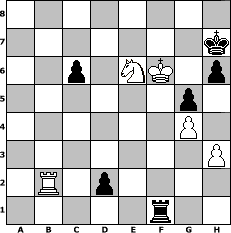 Partie-Notation im PGN-Format [Event "YOUR LAST BREATH"] [Site "www.mySchach.de"] [Date "2019.11.17"] [Round "2"] [White "wolni55"] [Black "Gauss1233"] [ECO "C50"] [WhitemyELO "1359"] [BlackmyELO "1428"] [Result "0-1"] [TimeControl "10/3456000"] [WhiteDays "38"] [BlackDays "40"] [MySchachNr "116352"] 1. e4 e5 2. Nf3 Nc6 3. Bc4 h6 4. a3 Nf6 5. d3 Be7 6. Bb5 d6 7. Bxc6+ bxc6 8. h3 O-O 9. Nc3 Nh7 10. Be3 f5 11. exf5 Bxf5 12. g4 Bc8 13. Qe2 Ng5 14. Nxg5 Bxg5 15. O-O-O d5 16. Na4 d4 17. Bd2 Bxd2+ 18. Rxd2 Qd6 19. Re1 Re8 20. Qe4 Bd7 21. b4 a5 22. Nc5 axb4 23. axb4 Ra1+ 24. Kb2 Rxe1 25. Qxe1 Rb8 26. c3 dxc3+ 27. Kxc3 Qd4+ 28. Kc2 Rxb4 29. Qe3 Qb2+ 30. Kd1 Qa1+ 31. Ke2 Bc8 32. Kf3 Qc3 33. Kg3 Rb5 34. Ne4 Qd4 35. Qxd4 exd4 36. Ra2 Bb7 37. Ra4 c5 38. Nd2 Bd5 39. f4 Rb4 40. Ra5 Rb2 41. Rxc5 c6 42. Nf1 Rb3 43. Kh4 Rxd3 44. f5 Bg2 45. Ng3 Rd2 46. Nh5 d3 47. Nf4 Bf3 48. Rc3 Be4 49. Kh5 Rd1 50. Kg6 Kf8 51. Ne6+ Kg8 52. Rb3 Bxf5+ 53. Kxf5 Kh7 54. Nf4 d2 55. Rb2 g6+ 56. Kf6 g5 57. Ne6 Rf1+ 0-1 Stellungs-Notation im FEN-Format 8/7k/2p1NK1p/6p1/6P1/7P/1R1p4/5r2 - - - 2 58 Geschlagene Figuren Weiss: Geschlagene Figuren Schwarz: Klicken Sie auf eine geschlagene Figur um den gewünschten Zug darzustellen!
