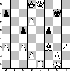 Partie-Notation im PGN-Format [Event "Schach dem Osterhasen IV"] [Site "www.mySchach.de"] [Date "2015.03.29"] [Round "1"] [White "reisinger"] [Black "alpacino"] [ECO "A40"] [WhitemyELO "1488"] [BlackmyELO "1273"] [Result "1-0"] [TimeControl "10/2592000"] [WhiteDays "120"] [BlackDays "108"] [MySchachNr "98743"] 1. d4 e6 2. c4 Nf6 3. Nc3 Bb4 4. a3 Bxc3+ 5. bxc3 c6 6. e3 Ne4 7. Qc2 Nd6 8. Bd3 g6 9. Nf3 b6 10. e4 Bb7 11. e5 Nf5 12. Bg5 Qc7 13. Bf6 Rg8 14. Ng5 d6 15. Nxh7 Nd7 16. exd6 Qxd6 17. Be5 Qe7 18. O-O f6 19. Nxf6+ Nxf6 20. Rfe1 Ng4 21. h3 Nxe5 22. Rxe5 Rd8 23. Rae1 Rd6 24. c5 bxc5 25. dxc5 Kd7 26. Bxf5 gxf5 27. cxd6 c5 28. f3 Qg7 29. Rxe6 Bxf3 30. Qa4+ Kd8 31. Re8+ Rxe8 32. Qxe8# 1-0 Stellungs-Notation im FEN-Format 3kQ3/p5q1/3P4/2p2p2/8/P1P2b1P/3P2P1/4R1K1 - - - 0 32 Geschlagene Figuren Weiss: Geschlagene Figuren Schwarz: Klicken Sie auf eine geschlagene Figur um den gewünschten Zug darzustellen!