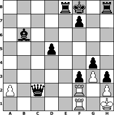 Partie-Notation im PGN-Format [Event "Winter 19/20"] [Site "www.mySchach.de"] [Date "2020.01.09"] [Round "1"] [White "martinus"] [Black "Grubengeist"] [ECO "D02"] [WhitemyELO "1674"] [BlackmyELO "2045"] [Result "0-1"] [TimeControl "10/2592000"] [WhiteDays "100"] [BlackDays "100"] [MySchachNr "116897"] 1. d4 d5 2. Nf3 Nf6 3. Bf4 Bf5 4. Nc3 c6 5. e3 Nbd7 6. Bd3 Bxd3 7. Qxd3 e6 8. O-O Be7 9. Ne5 Nh5 10. Ne2 g5 11. Nxd7 Qxd7 12. Bg3 Nxg3 13. Nxg3 O-O-O 14. c4 h5 15. c5 h4 16. Ne2 e5 17. b4 e4 18. Qa3 h3 19. g3 Qf5 20. f4 exf3 21. Nc3 g4 22. Qxa7 Qc2 23. Qa8+ Kc7 24. Qa5+ Kb8 25. Rf2 Qxc3 26. Raf1 Qxe3 27. b5 Qxd4 28. b6 Bxc5 29. Qa7+ Kc8 30. Qa8+ Kd7 31. Qxb7+ Ke8 32. Qxc6+ Kf8 33. Kh1 Bxb6 34. Qc2 Re8 35. Rd2 Qe4 36. Rdf2 Qxc2 0-1 Stellungs-Notation im FEN-Format 4rk1r/5p2/1b6/3p4/6p1/5pPp/P1q2R1P/5R1K - - - 0 37 Geschlagene Figuren Weiss: Geschlagene Figuren Schwarz: Klicken Sie auf eine geschlagene Figur um den gewünschten Zug darzustellen!
