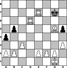 Partie-Notation im PGN-Format [Event "Bergkristall"] [Site "www.mySchach.de"] [Date "2022.07.05"] [Round "1"] [White "Lohl"] [Black "Achimkogge"] [ECO "C41"] [WhitemyELO "1487"] [BlackmyELO "1386"] [Result "1-0"] [TimeControl "10/1728000"] [WhiteDays "20"] [BlackDays "20"] [MySchachNr "126343"] 1. e4 e5 2. Nf3 d6 3. Bc4 Bg4 4. h3 Bd7 5. O-O c6 6. d4 b5 7. Bb3 exd4 8. Nxd4 h6 9. Nd2 Nf6 10. Re1 g5 11. e5 dxe5 12. Rxe5+ Be7 13. Ne4 Nxe4 14. Rxe4 h5 15. Bxg5 Be6 16. Nxe6 Qxd1+ 17. Rxd1 fxe6 18. Rxe6 Rh7 19. c3 Nd7 20. Re1 Nf8 21. Rxc6 Rd8 22. Rc7 Nd7 23. Bc2 a5 24. Bxh7 Kf8 25. Bxe7+ Kg7 26. Bxd8 Kxh7 27. Rxd7+ Kg6 28. Re5 a4 29. Rd6+ Kf7 30. Bg5 Kg7 31. Re7+ 1-0 Stellungs-Notation im FEN-Format 8/4R1k1/3R4/1p4Bp/p7/2P4P/PP2PPP1/6K1 - - - 5 31 Geschlagene Figuren Weiss: ![]() ![]() ![]() ![]() ![]() ![]() ![]() ![]() ![]() ![]() ![]() ![]() ![]() ![]() ![]() Geschlagene Figuren Schwarz: ![]() ![]() ![]() ![]() ![]() ![]() ![]() ![]() ![]() ![]() ![]() ![]() ![]() ![]() ![]() Klicken Sie auf eine geschlagene Figur um den gewünschten Zug darzustellen!