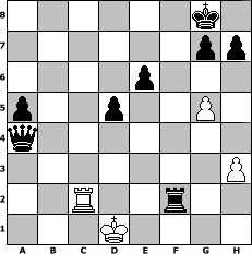 Partie-Notation im PGN-Format [Event "Master Classice"] [Site "www.mySchach.de"] [Date "2005.05.14"] [Round "1"] [White "Pocket"] [Black "Juri"] [ECO "A03"] [WhitemyELO "1338"] [BlackmyELO "1256"] [Result "0-1"] [TimeControl "10/1728000"] [WhiteDays "20"] [BlackDays "17"] [MySchachNr "13006"] 1. f4 d5 2. Nf3 Nc6 3. e3 Bg4 4. Be2 e6 5. h3 Bxf3 6. Bxf3 Qh4+ 7. Kf1 Nb4 8. Qe2 Nxc2 9. Qb5+ c6 10. Qe2 Nxa1 11. d4 Bb4 12. Bd2 Nc2 13. Na3 Nxa3 14. Bxb4 Nb5 15. Be1 Qf6 16. a4 Nd6 17. Qd2 Nc4 18. Qb4 b6 19. Ke2 Ne7 20. Bf2 a5 21. Qc3 O-O 22. b3 Nd6 23. g4 c5 24. g5 Qg6 25. dxc5 Ne4 26. Bxe4 Qxe4 27. Rd1 Nf5 28. cxb6 Rac8 29. Qd2 Rc2 30. Rc1 Rxd2+ 31. Kxd2 Qb4+ 32. Ke2 Qxb6 33. e4 Qxb3 34. exf5 Qb2+ 35. Kd1 Qxf2 36. fxe6 fxe6 37. Rc2 Qxf4 38. Rc6 Qxa4+ 39. Rc2 Rf2 0-1 Stellungs-Notation im FEN-Format 6k1/6pp/4p3/p2p2P1/q7/7P/2R2r2/3K4 - - - 2 40 Geschlagene Figuren Weiss: Geschlagene Figuren Schwarz: Klicken Sie auf eine geschlagene Figur um den gewünschten Zug darzustellen!