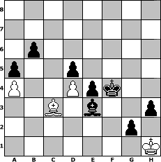 | Partie-Notation im PGN-Format [Event "In Memorium Michael Knopf 4"] [Site "www.mySchach.de"] [Date "2015.04.10"] [Round "1"] [White "Master1"] [Black "kalle"] [ECO "A45"] [WhitemyELO "1325"] [BlackmyELO "1617"] [Result "0-1"] [TimeControl "10/2592000"] [WhiteDays "131"] [BlackDays "136"] [MySchachNr "98907"] 1. d4 Nf6 2. e3 e6 3. Bd3 b6 4. Nf3 Bb7 5. O-O c5 6. c3 d5 7. Bb5+ Nc6 8. Ne5 Qc7 9. Nxc6 Bxc6 10. Bxc6+ Qxc6 11. Nd2 Bd6 12. Nf3 O-O 13. Ne5 Qc7 14. f4 Ne4 15. b3 Nxc3 16. Qf3 cxd4 17. exd4 Rac8 18. Bb2 Ne4 19. Rac1 Qb7 20. Rxc8 Rxc8 21. Rd1 f6 22. Nd3 Rc2 23. h3 Qa6 24. a4 Qc8 25. Bc1 a5 26. g4 Qc3 27. h4 Qxb3 28. h5 Rf2 29. Qxf2 Qxd1+ 30. Qf1 Qxg4+ 31. Qg2 Qd1+ 32. Qf1 Qxh5 33. Nf2 Nxf2 34. Qxf2 Qd1+ 35. Qf1 Qxf1+ 36. Kxf1 e5 37. fxe5 fxe5 38. Bb2 e4 39. Ke2 g5 40. Bc1 Bf4 41. Ba3 Kf7 42. Bb2 h5 43. Bc3 g4 44. Be1 g3 45. Kf1 Kf6 46. Kg2 h4 47. Bc3 Bc1 48. Be1 Kg5 49. Kh3 Be3 50. Bc3 Kf4 51. Kg2 h3+ 52. Kh1 g2+ 0-1 Stellungs-Notation im FEN-Format 8/8/1p6/p2p4/P2Ppk2/2B1b2p/6p1/7K - - - 0 53 Geschlagene Figuren Weiss:                              Geschlagene Figuren Schwarz:                               Klicken Sie auf eine geschlagene Figur um den gewünschten Zug darzustellen!
