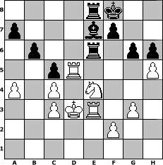 Partie-Notation im PGN-Format [Event "Wrixum - Open die IX"] [Site "www.mySchach.de"] [Date "2011.10.15"] [Round "1"] [White "pepo47"] [Black "Tomino"] [ECO "B19"] [WhitemyELO "1983"] [BlackmyELO "1768"] [Result "1/2-1/2"] [TimeControl "10/2592000"] [WhiteDays "118"] [BlackDays "078"] [MySchachNr "76912"] 1. e4 c6 2. d4 d5 3. Nc3 dxe4 4. Nxe4 Bf5 5. Ng3 Bg6 6. h4 h6 7. Nf3 Nd7 8. h5 Bh7 9. Bd3 Bxd3 10. Qxd3 e6 11. Bf4 Qa5+ 12. Bd2 Bb4 13. c3 Be7 14. c4 Qc7 15. O-O-O Ngf6 16. Kb1 O-O 17. Ne4 Rad8 18. Nxf6+ Nxf6 19. Qe2 c5 20. Bc3 Qf4 21. d5 Qe4+ 22. Qxe4 Nxe4 23. Rhe1 exd5 24. Rxd5 Nxc3+ 25. bxc3 Bf6 26. Kc2 b6 27. Nd2 Rde8 28. Ne4 Bh4 29. Kd2 Re6 30. g3 Be7 31. Re3 Re8 32. Kd3 Kf8 33. a4 g6 1/2-1/2 Stellungs-Notation im FEN-Format 4rk2/p3bp2/1p2r1pp/2pR3P/P1P1N3/2PKR1P1/5P2/8 - - - 0 34 Geschlagene Figuren Weiss: Geschlagene Figuren Schwarz: Klicken Sie auf eine geschlagene Figur um den gewünschten Zug darzustellen!