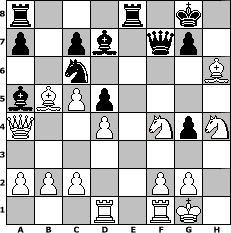 Partie-Notation im PGN-Format [Event "9erD"] [Site "www.mySchach.de"] [Date "2010.11.09"] [Round "1"] [White "Jolilein"] [Black "spiderman"] [ECO "A16"] [WhitemyELO "1857"] [BlackmyELO "1612"] [Result "1-0"] [TimeControl "10/3456000"] [WhiteDays "38"] [BlackDays "39"] [MySchachNr "69681"] 1. c4 Nf6 2. Nc3 e5 3. e4 Bc5 4. Nf3 O-O 5. Nxe5 Nc6 6. Nf3 Re8 7. d3 Ng4 8. d4 Bb4 9. Be2 Rxe4 10. O-O Re8 11. Bg5 f6 12. Bd2 d6 13. Bd3 f5 14. Bg5 Qd7 15. Nd5 Qf7 16. h3 Nh6 17. Qa4 Ba5 18. Nf4 Ng4 19. hxg4 fxg4 20. Nh4 Bd7 21. c5 d5 22. Rad1 b5 23. Bxb5 h6 24. Bxh6 1-0 Stellungs-Notation im FEN-Format r3r1k1/p1pb1qp1/2n4B/bBPp4/Q2P1NpN/8/PPP2PP1/3R1RK1 - - - 0 24 Geschlagene Figuren Weiss: Geschlagene Figuren Schwarz: Klicken Sie auf eine geschlagene Figur um den gewünschten Zug darzustellen!