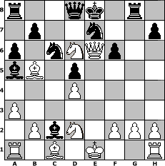 Partie-Notation im PGN-Format [Event "Sommerturnier f"] [Site "www.mySchach.de"] [Date "2009.08.14"] [Round "1"] [White "Caligula"] [Black "Steppenwolf"] [ECO "B12"] [WhitemyELO "1440"] [BlackmyELO "1143"] [Result "1-0"] [TimeControl "10/1728000"] [WhiteDays "20"] [BlackDays "16"] [MySchachNr "58325"] 1. e4 c6 2. d4 d5 3. e5 Bf5 4. Nf3 e6 5. c4 Bb4+ 6. Nbd2 f6 7. cxd5 cxd5 8. Bb5+ Nc6 9. Qe2 Nge7 10. a3 Ba5 11. Nh4 Bc2 12. exf6 gxf6 13. Qxe6 a6 14. Nf5 Rg8 15. Nd6+ 1-0 Stellungs-Notation im FEN-Format r2qk1r1/1p2n2p/p1nNQp2/bB1p4/3P4/P7/1PbN1PPP/R1B1K2R - KQq - 3 15 Geschlagene Figuren Weiss: ![]() ![]() ![]() ![]() ![]() ![]() ![]() ![]() ![]() ![]() ![]() ![]() ![]() ![]() ![]() Geschlagene Figuren Schwarz: ![]() ![]() ![]() ![]() ![]() ![]() ![]() ![]() ![]() ![]() ![]() ![]() ![]() ![]() ![]() Klicken Sie auf eine geschlagene Figur um den gewünschten Zug darzustellen!