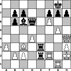 Partie-Notation im PGN-Format [Event "Trainingslager II"] [Site "www.mySchach.de"] [Date "2011.05.24"] [Round "2"] [White "Duschgel"] [Black "Lemmi11"] [ECO "A15"] [WhitemyELO "1571"] [BlackmyELO "1706"] [Result "0-1"] [TimeControl "10/1728000"] [WhiteDays "20"] [BlackDays "20"] [MySchachNr "74155"] 1. c4 Nf6 2. g3 e5 3. Bg2 Bc5 4. e3 Nc6 5. Nc3 d6 6. Nge2 Bb6 7. O-O O-O 8. a3 Bg4 9. h3 Be6 10. Nd5 Bf5 11. d4 exd4 12. Nxb6 axb6 13. Nxd4 Nxd4 14. exd4 d5 15. g4 Be4 16. f3 Bg6 17. g5 Nh5 18. cxd5 Re8 19. f4 Ng3 20. Rf2 Be4 21. Qg4 Bxg2 22. Qxg3 Bxd5 23. Bd2 Bc6 24. Bc3 Qd5 25. Kh2 Re7 26. f5 Rae8 27. f6 Re2 28. Rg1 R8e3 29. Qh4 Qd6+ 0-1 Stellungs-Notation im FEN-Format 6k1/1pp2ppp/1pbq1P2/6P1/3P3Q/P1B1r2P/1PP1rR1K/6R1 - - - 5 30 Geschlagene Figuren Weiss: Geschlagene Figuren Schwarz: Klicken Sie auf eine geschlagene Figur um den gewünschten Zug darzustellen!