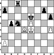 Partie-Notation im PGN-Format [Event "Es wird Fr"] [Site "www.mySchach.de"] [Date "2009.03.13"] [Round "1"] [White "Flang"] [Black "UPS"] [ECO "B32"] [WhitemyELO "1441"] [BlackmyELO "1653"] [Result "0-1"] [TimeControl "10/2592000"] [WhiteDays "058"] [BlackDays "105"] [MySchachNr "53734"] 1. e4 c5 2. Nf3 Nc6 3. d4 cxd4 4. Nxd4 e5 5. Nf3 Nf6 6. Nc3 h6 7. Bc4 Bb4 8. O-O Bxc3 9. bxc3 O-O 10. Bd3 d5 11. Qe2 Bg4 12. c4 Nd4 13. Qe3 dxc4 14. Bxc4 Nxc2 15. Qc3 Nxa1 16. Qxa1 Bxf3 17. gxf3 Qd4 18. Qxd4 exd4 19. Rd1 Rac8 20. Rxd4 b5 21. e5 Nh7 22. Bxf7+ Rxf7 23. Bb2 Rxf3 24. Rd2 Ng5 25. Re2 Kf7 26. h4 Nh3+ 27. Kg2 Rxf2+ 28. Rxf2+ Nxf2 29. Bd4 Nd3 30. Kf3 Ke6 31. Ke4 Nc5+ 0-1 Stellungs-Notation im FEN-Format 2r5/p5p1/4k2p/1pn1P3/3BK2P/8/P7/8 - - - 6 32 Geschlagene Figuren Weiss: Geschlagene Figuren Schwarz: Klicken Sie auf eine geschlagene Figur um den gewünschten Zug darzustellen!