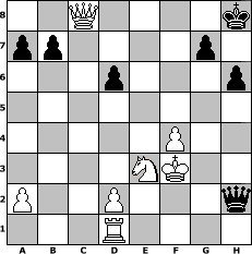 Partie-Notation im PGN-Format [Event "Abermals Aljechin"] [Site "www.mySchach.de"] [Date "2011.02.13"] [Round "1"] [White "muellerh"] [Black "reisinger"] [ECO "A52"] [WhitemyELO "1531"] [BlackmyELO "1426"] [Result "1-0"] [TimeControl "10/1728000"] [WhiteDays "69"] [BlackDays "80"] [MySchachNr "71968"] 1. d4 Nf6 2. c4 e5 3. dxe5 Ng4 4. e4 d6 5. exd6 Bxd6 6. Be2 f5 7. exf5 Qe7 8. Nh3 Nxh2 9. Bg5 Qe5 10. Nc3 Bxf5 11. f4 Qe3 12. Rxh2 h6 13. Bh4 Nc6 14. Nd5 Qe6 15. c5 Bxh3 16. Rxh3 O-O 17. cxd6 cxd6 18. Re3 Qg6 19. g3 Rae8 20. Qb3 Kh8 21. Kf2 Qf7 22. Bc4 Na5 23. Qc3 Rxe3 24. Nxe3 Nxc4 25. Qxc4 Qd7 26. Rd1 Qh3 27. Qf1 Rxf4+ 28. gxf4 Qxh4+ 29. Ke2 Qh5+ 30. Qf3 Qb5+ 31. Kf2 Qxb2+ 32. Qe2 Qb4 33. Qc4 Qb2+ 34. Kf3 Qh2 35. Qc8+ 1-0 Stellungs-Notation im FEN-Format 2Q4k/pp4p1/3p3p/8/5P2/4NK2/P2P3q/3R4 - - - 7 35 Geschlagene Figuren Weiss: Geschlagene Figuren Schwarz: Klicken Sie auf eine geschlagene Figur um den gewünschten Zug darzustellen!