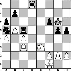 Partie-Notation im PGN-Format [Event "Fr"] [Site "www.mySchach.de"] [Date "2008.03.06"] [Round "1"] [White "WalterKelsch7"] [Black "bruno"] [ECO "B23"] [WhitemyELO "1792"] [BlackmyELO "1522"] [Result "0-1"] [TimeControl "10/1728000"] [WhiteDays "73"] [BlackDays "80"] [MySchachNr "43216"] 1. e4 c5 2. Nc3 Nc6 3. Nf3 a6 4. d4 e6 5. d5 exd5 6. Nxd5 Nf6 7. Bg5 Be7 8. Bc4 O-O 9. O-O Nxd5 10. Qxd5 d6 11. a3 Be6 12. Bxe7 Bxd5 13. Bxd8 Bxc4 14. Bc7 Bxf1 15. Kxf1 Rfe8 16. Bxd6 Rxe4 17. b3 Rae8 18. Bxc5 Re2 19. Rc1 R2e4 20. Nd2 R4e5 21. b4 Rd8 22. Nc4 Re6 23. Ne3 g5 24. Nf5 h5 25. c3 f6 26. c4 Re5 27. Ne3 Kg7 28. a4 Kg6 29. b5 Na5 30. Rc3 Rxc5 0-1 Stellungs-Notation im FEN-Format 3r4/1p6/p4pk1/nPr3pp/P1P5/2R1N3/5PPP/5K2 - - - 0 31 Geschlagene Figuren Weiss: Geschlagene Figuren Schwarz: Klicken Sie auf eine geschlagene Figur um den gewünschten Zug darzustellen!
