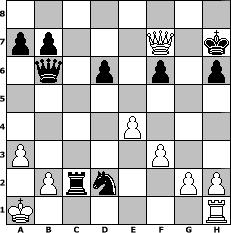 Partie-Notation im PGN-Format [Event "Morra Gambit II"] [Site "www.mySchach.de"] [Date "2012.11.30"] [Round "2"] [White "Duschgel"] [Black "Vahl1"] [ECO "B20"] [WhitemyELO "1601"] [BlackmyELO "1644"] [Result "1/2-1/2"] [TimeControl "10/1728000"] [WhiteDays "55"] [BlackDays "33"] [MySchachNr "85229"] 1. e4 c5 2. d4 cxd4 3. c3 Nf6 4. Bd3 e5 5. cxd4 exd4 6. Bg5 Bb4+ 7. Nd2 h6 8. Bh4 d6 9. Ne2 Bg4 10. f3 Be6 11. Nxd4 O-O 12. Nxe6 fxe6 13. Qb3 Nc6 14. Qxe6+ Kh8 15. a3 Qb6 16. O-O-O Nd4 17. Qa2 Rac8+ 18. Kb1 Bxd2 19. Rxd2 Nb3 20. Rc2 Rxc2 21. Bxc2 Nd2+ 22. Ka1 Rc8 23. Bxf6 Rxc2 24. Qf7 gxf6 25. Qf8+ Kh7 26. Qf7+ 1/2-1/2 Stellungs-Notation im FEN-Format 8/pp3Q1k/1q1p1p1p/8/4P3/P4P2/1Prn2PP/K6R - - - 3 26 Geschlagene Figuren Weiss: Geschlagene Figuren Schwarz: Klicken Sie auf eine geschlagene Figur um den gewünschten Zug darzustellen!