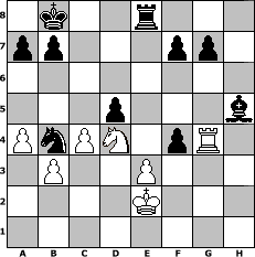 Partie-Notation im PGN-Format [Event "Aprilturnier"] [Site "www.mySchach.de"] [Date "2016.04.22"] [Round "1"] [White "S04boy"] [Black "Schefsche"] [ECO "D00"] [WhitemyELO "1167"] [BlackmyELO "1417"] [Result "0-1"] [TimeControl "10/1728000"] [WhiteDays "66"] [BlackDays "67"] [MySchachNr "103358"] 1. d4 d5 2. Bf4 Bf5 3. h3 e6 4. g4 Be4 5. f3 Bg6 6. h4 h5 7. Bh3 Nc6 8. Qd2 Qxh4+ 9. Kd1 Qe7 10. Nc3 Qb4 11. b3 Bd6 12. a3 Qxd4 13. Bxd6 Qxd2+ 14. Kxd2 cxd6 15. gxh5 Rxh5 16. Nb5 O-O-O 17. f4 d4 18. Nf3 Rxb5 19. a4 Rc5 20. Rac1 Nb4 21. Nxd4 Rd5 22. e3 Kb8 23. c4 Rh5 24. Bg4 Rxh1 25. Rxh1 Nh6 26. Rf1 Nxg4 27. f5 exf5 28. Rg1 d5 29. Ke2 Re8 30. Rg3 f4 31. Rxg4 Bh5 0-1 Stellungs-Notation im FEN-Format 1k2r3/pp3pp1/8/3p3b/PnPN1pR1/1P2P3/4K3/8 - - - 1 32 Geschlagene Figuren Weiss: Geschlagene Figuren Schwarz: Klicken Sie auf eine geschlagene Figur um den gewünschten Zug darzustellen!