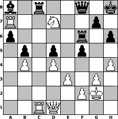 Partie-Notation im PGN-Format [Event "1. Howard Staunton Turnier 2010"] [Site "www.mySchach.de"] [Date "2010.07.05"] [Round "1"] [White "kari6katz"] [Black "brucybabe"] [ECO "A13"] [WhitemyELO "1772"] [BlackmyELO "1686"] [Result "1-0"] [TimeControl "10/1728000"] [WhiteDays "20"] [BlackDays "19"] [MySchachNr "66808"] 1. c4 e6 2. Nf3 d5 3. d4 Nf6 4. Nc3 Be7 5. Qc2 O-O 6. Bg5 c6 7. e3 dxc4 8. Bxc4 Nd5 9. Bxe7 Qxe7 10. a3 Nd7 11. O-O N7f6 12. h3 Rd8 13. Ne2 b5 14. Bd3 Bb7 15. Ne5 Rac8 16. b4 Qd6 17. Rac1 h6 18. Ng3 Nd7 19. Nxd7 Qxd7 20. Ne4 Ba8 21. Qe2 f5 22. Nc5 Qd6 23. g3 Rf8 24. Qh5 Qe7 25. Kh2 Nf6 26. Qf3 Rce8 27. Bb1 Qd6 28. Ba2 Kh8 29. Rcd1 Nd5 30. Rd3 Qe7 31. Kg2 Qc7 32. Bxd5 exd5 33. Qh5 Qe7 34. h4 Rf6 35. Rc3 Rd8 36. Ra1 Bb7 37. a4 a6 38. axb5 cxb5 39. Qd1 Re8 40. Rac1 Rb8 41. Nd3 Rd8 42. Rc7 Rd7 43. R7c2 Ba8 44. Ne5 Rd8 45. Rc7 Qf8 46. Ra7 Rc8 47. Nd7 1-0 Stellungs-Notation im FEN-Format b1r2q1k/R2N2p1/p4r1p/1p1p1p2/1P1P3P/4P1P1/5PK1/2RQ4 - - - 17 47 Geschlagene Figuren Weiss: Geschlagene Figuren Schwarz: Klicken Sie auf eine geschlagene Figur um den gewünschten Zug darzustellen!