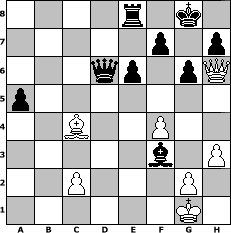 Partie-Notation im PGN-Format [Event "9er5"] [Site "www.mySchach.de"] [Date "2015.01.04"] [Round "1"] [White "Joschi"] [Black "Naunhofer"] [ECO "B32"] [WhitemyELO "1596"] [BlackmyELO "1605"] [Result "0-1"] [TimeControl "10/3456000"] [WhiteDays "40"] [BlackDays "40"] [MySchachNr "97430"] 1. e4 c5 2. Nf3 Nc6 3. d4 cxd4 4. Nxd4 e6 5. Bc4 Nf6 6. f3 Be7 7. Nxc6 dxc6 8. O-O Qb6+ 9. Kh1 O-O 10. Qe2 Qc7 11. Nc3 b6 12. Be3 b5 13. Bd3 a5 14. a3 Bb7 15. Rfd1 Rfd8 16. Rd2 Rd7 17. Rad1 Rad8 18. f4 b4 19. axb4 Bxb4 20. e5 Bxc3 21. bxc3 Nd5 22. Ra1 Nxc3 23. Qh5 g6 24. Qh6 c5 25. Rf2 c4 26. Bf1 Rd1 27. Rxd1 Rxd1 28. h3 Qc6 29. Kg1 Qe4 30. Bc5 Rd8 31. Bd6 Re8 32. Bc5 Qc6 33. Bd6 Ne4 34. Rf3 Nxd6 35. exd6 Qxd6 36. Bxc4 Bxf3 0-1 Stellungs-Notation im FEN-Format 4r1k1/5p1p/3qp1pQ/p7/2B2P2/5b1P/2P3P1/6K1 - - - 0 37 Geschlagene Figuren Weiss: Geschlagene Figuren Schwarz: Klicken Sie auf eine geschlagene Figur um den gewünschten Zug darzustellen!
