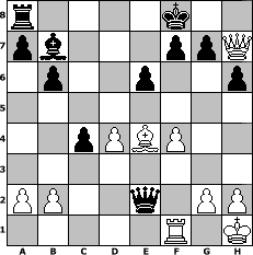 Partie-Notation im PGN-Format [Event "MN-2012-1"] [Site "www.mySchach.de"] [Date "2012.07.24"] [Round "1"] [White "espero"] [Black "Helmut48"] [ECO "A40"] [WhitemyELO "1726"] [BlackmyELO "1962"] [Result "0-1"] [TimeControl "10/2592000"] [WhiteDays "29"] [BlackDays "23"] [MySchachNr "82928"] 1. d4 e6 2. e4 b6 3. Nf3 Bb7 4. Bd3 c5 5. c3 d6 6. O-O Nd7 7. Qe2 Ngf6 8. Bg5 Be7 9. Nbd2 O-O 10. Rad1 h6 11. Bxf6 Bxf6 12. e5 dxe5 13. dxe5 Nxe5 14. Nxe5 Bxe5 15. Nf3 Bd6 16. Bc2 Qc7 17. Qd3 Rfd8 18. Qh7+ Kf8 19. Rd3 c4 20. Rxd6 Qxd6 21. Nd4 Qe5 22. f4 Qe3+ 23. Kh1 Qd2 24. Be4 Rxd4 25. cxd4 Qe2 0-1 Stellungs-Notation im FEN-Format r4k2/pb3ppQ/1p2p2p/8/2pPBP2/8/PP2q1PP/5R1K - - - 1 26 Geschlagene Figuren Weiss: Geschlagene Figuren Schwarz: Klicken Sie auf eine geschlagene Figur um den gewünschten Zug darzustellen!