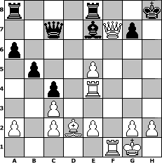 Partie-Notation im PGN-Format [Event "Jahreswechsel"] [Site "www.mySchach.de"] [Date "2009.12.30"] [Round "2"] [White "frankto"] [Black "lasker"] [ECO "C42"] [WhitemyELO "1693"] [BlackmyELO "1339"] [Result "1-0"] [TimeControl "10/1728000"] [WhiteDays "59"] [BlackDays "58"] [MySchachNr "61939"] 1. e4 e5 2. Nf3 Nf6 3. Nc3 d6 4. d4 exd4 5. Nxd4 Be7 6. Bc4 O-O 7. Bg5 h6 8. Be3 Bd7 9. O-O Nc6 10. Qd2 Nxd4 11. Bxd4 a6 12. f4 b5 13. Bd3 c5 14. Be3 Bc6 15. e5 dxe5 16. fxe5 Nd5 17. Bxh6 Nxc3 18. bxc3 Re8 19. Qf2 Bd5 20. Bd2 Qc7 21. Rae1 c4 22. Be4 Bxe4 23. Qxf7+ Kh8 24. Rxe4 1-0 Stellungs-Notation im FEN-Format r3r2k/2q1bQp1/p7/1p2P3/2p1R3/2P5/P1PBP1PP/5RK1 - - - 0 24 Geschlagene Figuren Weiss: Geschlagene Figuren Schwarz: Klicken Sie auf eine geschlagene Figur um den gewünschten Zug darzustellen!