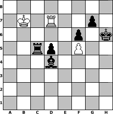 Partie-Notation im PGN-Format [Event "Ab in den Fr"] [Site "www.mySchach.de"] [Date "2015.03.05"] [Round "1"] [White "Haneken"] [Black "mudb"] [ECO "C50"] [WhitemyELO "1059"] [BlackmyELO "997"] [Result "0-1"] [TimeControl "10/1728000"] [WhiteDays "82"] [BlackDays "37"] [MySchachNr "98388"] 1. e4 e5 2. Nf3 Nc6 3. Bc4 Qe7 4. Nc3 h6 5. Nd5 Qd6 6. d3 Nd4 7. Nxe5 Qxe5 8. O-O Nf6 9. c3 Nxd5 10. cxd4 Qxd4 11. exd5 Bd6 12. Qe2+ Be7 13. Be3 Qe5 14. f4 Qf5 15. d4 O-O 16. b3 a6 17. Rac1 b5 18. Bd3 Qxd5 19. Qf3 Qxf3 20. Rxf3 Bb7 21. Rg3 Rac8 22. h3 Bh4 23. Rg4 Bf6 24. f5 Rce8 25. Bxh6 Re3 26. Rxc7 Rxd3 27. Rxb7 Rd1+ 28. Kh2 Rxd4 29. Rxd4 Bxd4 30. Bf4 Rd8 31. h4 Bf6 32. Bc7 Re8 33. h5 d5 34. Ra7 Re7 35. g4 Be5+ 36. Kh3 Bxc7 37. Rxa6 Re3+ 38. Kg2 Rg3+ 39. Kf2 Rxg4 40. a4 Rf4+ 41. Ke3 Re4+ 42. Kd3 Be5 43. Ra8+ Kh7 44. Rf8 Rd4+ 45. Ke3 f6 46. axb5 Rb4 47. Kd3 Rxb3+ 48. Kc2 Rxb5 49. Rf7 Rc5+ 50. Kb3 Rc3+ 51. Kb4 Bd4 52. Rd7 Rc4+ 53. Kb5 Rc5+ 54. Kb6 Rc4+ 55. Kb7 Rc5 56. h6 Kxh6 0-1 Stellungs-Notation im FEN-Format 8/1K1R2p1/5p1k/2rp1P2/3b4/8/8/8 - - - 0 57 Geschlagene Figuren Weiss: Geschlagene Figuren Schwarz: Klicken Sie auf eine geschlagene Figur um den gewünschten Zug darzustellen!