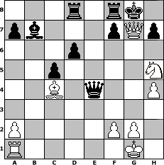 Partie-Notation im PGN-Format [Event "Polnische Er"] [Site "www.mySchach.de"] [Date "2007.09.10"] [Round "1"] [White "Knight"] [Black "Ostseeboy"] [ECO "A00"] [WhitemyELO "1292"] [BlackmyELO "1378"] [Result "1-0"] [TimeControl "10/2592000"] [WhiteDays "88"] [BlackDays "90"] [MySchachNr "38010"] 1. b4 e5 2. Bb2 Bxb4 3. Bxe5 Nf6 4. Nf3 O-O 5. Nc3 Nc6 6. e3 Nxe5 7. Nxe5 d6 8. Nd3 Ba5 9. Nf4 b6 10. Ncd5 Nxd5 11. Nxd5 Bb7 12. Bc4 b5 13. Bb3 c6 14. Nf4 c5 15. c4 Qg5 16. h4 Qe7 17. O-O bxc4 18. Bxc4 Rad8 19. Qg4 Bxd2 20. Nh5 Bc3 21. e4 Bxa1 22. Rxa1 Qxe4 23. Qxg7# 1-0 Stellungs-Notation im FEN-Format 3r1rk1/pb3pQp/3p4/2p4N/2B1q2P/8/P4PP1/R5K1 - - - 0 23 Geschlagene Figuren Weiss: Geschlagene Figuren Schwarz: Klicken Sie auf eine geschlagene Figur um den gewünschten Zug darzustellen!