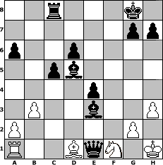 Partie-Notation im PGN-Format [Event "ES kann nur einen geben :-)"] [Site "www.mySchach.de"] [Date "2011.11.29"] [Round "2"] [White "Wulfen49"] [Black "HenrySchinasky"] [ECO "B07"] [WhitemyELO "1285"] [BlackmyELO "2097"] [Result "0-1"] [TimeControl "10/864000"] [WhiteDays "36"] [BlackDays "36"] [MySchachNr "77815"] 1. e4 d6 2. Nf3 Nf6 3. Nc3 c5 4. Be2 e5 5. O-O Be7 6. Re1 Be6 7. Ng5 Bd7 8. Bb5 Nc6 9. d3 a6 10. Ba4 Rc8 11. Bb3 O-O 12. Nf3 b5 13. Nd5 Nxd5 14. exd5 Na5 15. c4 Bg4 16. h3 Bh5 17. Bd2 f5 18. Bc2 bxc4 19. dxc4 Nxc4 20. b3 Nxd2 21. Qxd2 e4 22. Nh2 Bg5 23. Bd1 Bxd2 24. Rf1 Bf7 25. f3 Bxd5 26. fxe4 fxe4 27. Be2 Qa5 28. Bd1 Be3+ 29. Kh1 Rxf1+ 30. Nxf1 Qe1 0-1 Stellungs-Notation im FEN-Format 2r3k1/6pp/p2p4/2pb4/4p3/1P2b2P/P5P1/R2BqN1K - - - 1 31 Geschlagene Figuren Weiss: Geschlagene Figuren Schwarz: Klicken Sie auf eine geschlagene Figur um den gewünschten Zug darzustellen!
