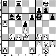 Partie-Notation im PGN-Format [Event "Chess for beginners"] [Site "www.mySchach.de"] [Date "2006.09.27"] [Round "1"] [Board "3"] [White "mickey"] [Black "nogumo"] [ECO "A04"] [WhitemyELO "1519"] [BlackmyELO "1750"] [Result "1-0"] [TimeControl "10/2592000"] [WhiteDays "26"] [BlackDays "29"] [MySchachNr "28983"] 1. Nf3 b5 2. e4 b4 3. a3 Bb7 4. axb4 Bxe4 5. g3 e6 6. c3 Nf6 7. Bg2 c5 8. bxc5 Bxc5 9. b4 Bb6 10. d4 O-O 11. O-O Nc6 12. Bg5 h6 13. Bxf6 Qxf6 14. Nbd2 Bd3 15. Re1 d5 16. Nb3 a5 17. Qxd3 Rfc8 18. bxa5 1-0 Stellungs-Notation im FEN-Format r1r3k1/5pp1/1bn1pq1p/P2p4/3P4/1NPQ1NP1/5PBP/R3R1K1 - - - 0 18 Geschlagene Figuren Weiss: Geschlagene Figuren Schwarz: Klicken Sie auf eine geschlagene Figur um den gewünschten Zug darzustellen!