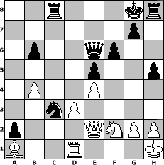 Partie-Notation im PGN-Format [Event "960-2018-56-Geburtstagsturnier"] [Site "www.mySchach.de"] [Date "2018.02.18"] [Round "1"] [White "muetoe"] [Black "Cuibono"] [Variant "Fischerrandom"] [SetUp "1"] [FEN "nbnrbqkr/pppppppp/8/8/8/8/PPPPPPPP/NBNRBQKR w KQkq - 0 1"] [WhitemyELO "1917"] [BlackmyELO "2245"] [Result "0-1"] [TimeControl "10/2592000"] [WhiteDays "29"] [BlackDays "30"] [MySchachNr "111495"] 1. Nab3 d5 2. f4 Nab6 3. Nd3 Nc4 4. Nbc5 N8d6 5. Qf3 b6 6. Na6 e6 7. O-O Qe7 8. c3 c5 9. Bc2 h5 10. Qh3 f6 11. f5 e5 12. Rc1 Qb7 13. Nxb8 Rxb8 14. b3 Na3 15. Bd1 Bd7 16. c4 Nxf5 17. cxd5 Nd4 18. Qh4 Qxd5 19. Nf2 Bc6 20. e4 Qd6 21. d3 Rd8 22. Bc3 Nab5 23. Bd2 Nc7 24. Rb1 a5 25. a3 Nce6 26. b4 cxb4 27. axb4 a4 28. Kh1 Ra8 29. Ra1 a3 30. Bc3 Be8 31. Qg3 Bf7 32. Qe3 Nb5 33. Qe1 Ned4 34. Bd2 a2 35. Bc1 Bb3 36. Qd2 Bxd1 37. Rxd1 Qe6 38. Bb2 Nb3 39. Qc2 Rc8 40. Qe2 Nxa1 41. Bxa1 Nc3 0-1 Stellungs-Notation im FEN-Format 2r3kr/6p1/1p2qp2/4p2p/1P2P3/2nP4/p3QNPP/B2R3K - k - 1 42 Geschlagene Figuren Weiss: Geschlagene Figuren Schwarz: Klicken Sie auf eine geschlagene Figur um den gewünschten Zug darzustellen!