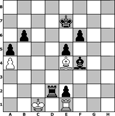 Partie-Notation im PGN-Format [Event "mal so"] [Site "www.mySchach.de"] [Date "2013.12.02"] [Round "1"] [White "muellerh"] [Black "alibengali"] [ECO "E70"] [WhitemyELO "1559"] [BlackmyELO "1595"] [Result "0-1"] [TimeControl "10/1728000"] [WhiteDays "18"] [BlackDays "20"] [MySchachNr "91460"] 1. d4 Nf6 2. c4 g6 3. Nc3 Bg7 4. e4 O-O 5. Nf3 d6 6. Bd3 e5 7. d5 a5 8. a4 Na6 9. Bd2 Nc5 10. Bc2 Bg4 11. h3 Bxf3 12. Qxf3 c6 13. O-O cxd5 14. cxd5 b6 15. Rab1 Rc8 16. Bg5 h6 17. Bh4 g5 18. Bg3 Re8 19. Rbc1 Qd7 20. h4 Qg4 21. Qe3 gxh4 22. Bd1 Qg5 23. Qxg5 hxg5 24. Bh2 Nfxe4 25. Nxe4 Nxe4 26. Bg4 Rxc1 27. Rxc1 Nf6 28. Bf3 g4 29. Be2 Nxd5 30. Bxg4 Nb4 31. Rd1 d5 32. g3 hxg3 33. Bxg3 d4 34. Bf5 f6 35. f3 Nd5 36. Bd7 Rd8 37. Be6+ Kf8 38. Bf2 Ke7 39. Bf5 Ne3 40. Bxe3 dxe3 41. Re1 Bh6 42. Kf1 Rd2 43. b3 Rb2 44. Be4 Rxb3 45. Ke2 Rb2+ 46. Kd1 Rd2+ 47. Kc1 e2 48. f4 Bxf4 0-1 Stellungs-Notation im FEN-Format 8/4k3/1p3p2/p3p3/P3Bb2/8/3rp3/2K1R3 - - - 0 49 Geschlagene Figuren Weiss: Geschlagene Figuren Schwarz: Klicken Sie auf eine geschlagene Figur um den gewünschten Zug darzustellen!