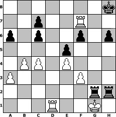 Partie-Notation im PGN-Format [Event "FREUNDESTUNIER"] [Site "www.mySchach.de"] [Date "2005.10.28"] [Round "2"] [White "Biber"] [Black "FreshPrinc2"] [ECO "C65"] [WhitemyELO "1211"] [BlackmyELO "910"] [Result "0-1"] [TimeControl "10/864000"] [WhiteDays "37"] [BlackDays "31"] [MySchachNr "19033"] 1. e4 e5 2. Nf3 Nc6 3. Bb5 Nf6 4. d3 Bb4+ 5. Nbd2 O-O 6. a3 Bxd2+ 7. Bxd2 d5 8. Bg5 a6 9. Bxc6 bxc6 10. c4 dxe4 11. dxe4 Bg4 12. Qxd8 Rfxd8 13. O-O Bxf3 14. gxf3 h6 15. Bxf6 gxf6 16. b4 Kh8 17. Rad1 Rg8+ 18. Kh1 Rg7 19. Rd7 Rag8 20. Re1 Rg2 21. Rc1 Rxf2 22. Rcd1 Rgg2 23. Rxf7 Rxh2+ 24. Kg1 Rfg2+ 25. Kf1 Rf2+ 26. Ke1 Re2+ 27. Kf1 Rhf2+ 28. Kg1 Rg2+ 29. Kh1 Rh2+ 30. Kg1 Reg2+ 0-1 Stellungs-Notation im FEN-Format 7k/2p2R2/p1p2p1p/4p3/1PP1P3/P4P2/6rr/3R2K1 - - - 14 31 Geschlagene Figuren Weiss: Geschlagene Figuren Schwarz: Klicken Sie auf eine geschlagene Figur um den gewünschten Zug darzustellen!