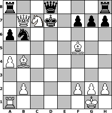 Partie-Notation im PGN-Format [Event "Wrixum - Open die VIII"] [Site "www.mySchach.de"] [Date "2011.01.17"] [Round "1"] [White "muetoe"] [Black "Achimkogge"] [ECO "A04"] [WhitemyELO "1843"] [BlackmyELO "1373"] [Result "1-0"] [TimeControl "10/2592000"] [WhiteDays "28"] [BlackDays "29"] [MySchachNr "71367"] 1. Nf3 a6 2. e4 b5 3. d4 Bb7 4. Bd3 d5 5. Nc3 dxe4 6. Nxe4 Nd7 7. O-O e6 8. a4 b4 9. Bd2 Bd5 10. c4 bxc3 11. Nxc3 Bc6 12. d5 exd5 13. Re1+ Be7 14. Nd4 Bb7 15. Nf5 Kf8 16. Qg4 Bf6 17. Qb4+ Ne7 18. Nxe7 Bxe7 19. Rxe7 Qxe7 20. Qxb7 Nb6 21. Nxd5 Qd8 22. Bb4+ Ke8 23. Nxc7+ Kd7 24. Bf5# 1-0 Stellungs-Notation im FEN-Format r2q3r/1QNk1ppp/pn6/5B2/PB6/8/1P3PPP/R5K1 - - - 2 24 Geschlagene Figuren Weiss: Geschlagene Figuren Schwarz: Klicken Sie auf eine geschlagene Figur um den gewünschten Zug darzustellen!