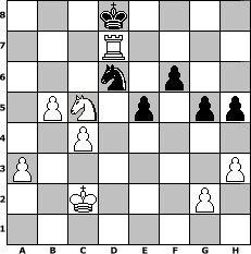 Partie-Notation im PGN-Format [Event "Krampusturnier"] [Site "www.mySchach.de"] [Date "2012.11.25"] [Round "1"] [White "Achimkogge"] [Black "Master1"] [ECO "A00"] [WhitemyELO "1441"] [BlackmyELO "1370"] [Result "1-0"] [TimeControl "10/1728000"] [WhiteDays "20"] [BlackDays "20"] [MySchachNr "85134"] 1. c3 e5 2. e4 Nf6 3. d4 exd4 4. Qxd4 Nc6 5. Qc4 Ne5 6. Qe2 Bc5 7. h3 O-O 8. Bg5 Be7 9. Nd2 d5 10. f3 a6 11. O-O-O Nfd7 12. Bxe7 Qxe7 13. exd5 f6 14. f4 Re8 15. fxe5 Qxe5 16. Qxe5 Rxe5 17. Bc4 Nc5 18. d6+ Be6 19. Bxe6+ Nxe6 20. Nc4 cxd6 21. Nxe5 dxe5 22. Rd7 b6 23. Ne2 h6 24. b4 Kf8 25. Rhd1 a5 26. b5 Ke8 27. Rb7 Rd8 28. Rxb6 Rxd1+ 29. Kxd1 Nc5 30. c4 Ne4 31. Kc2 a4 32. a3 g5 33. Kd3 Nc5+ 34. Kc2 Ne4 35. Rc6 Kd7 36. Nc3 Nd6 37. Nxa4 h5 38. Nc5+ Ke7 39. Rc7+ Kd8 40. Rd7+ 1-0 Stellungs-Notation im FEN-Format 3k4/3R4/3n1p2/1PN1p1pp/2P5/P6P/2K3P1/8 - - - 5 40 Geschlagene Figuren Weiss: Geschlagene Figuren Schwarz: Klicken Sie auf eine geschlagene Figur um den gewünschten Zug darzustellen!