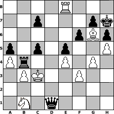 Partie-Notation im PGN-Format [Event "Schachmatt 2"] [Site "www.mySchach.de"] [Date "2017.01.12"] [Round "1"] [White "lotchi"] [Black "sprinterde"] [ECO "A00"] [WhitemyELO "1150"] [BlackmyELO "1729"] [Result "1-0"] [TimeControl "10/1728000"] [WhiteDays "16"] [BlackDays "20"] [MySchachNr "106466"] 1. Nc3 e5 2. e4 Nf6 3. Nf3 Bb4 4. a3 Bxc3 5. bxc3 O-O 6. d3 d6 7. Bg5 h6 8. Bxf6 Qxf6 9. Qd2 Bg4 10. Be2 Nd7 11. h3 Bxf3 12. Bxf3 Qg6 13. g4 b6 14. O-O-O Nc5 15. h4 Qe6 16. c4 f6 17. h5 a6 18. Qb4 Rfb8 19. Qb2 b5 20. cxb5 Rxb5 21. Qc3 Nb3+ 22. cxb3 Rc5 23. Qc4 Rxc4+ 24. dxc4 a5 25. a4 Qe7 26. Kc2 Qd8 27. Be2 Qb8 28. c5 dxc5 29. Rd7 Qb6 30. Bc4+ Kh7 31. Rhd1 Qc6 32. f3 Rb8 33. Re7 Rb4 34. Bd5 Qa6 35. Re8 Qe2+ 36. Kc3 Qxd1 37. Bg8+ Kh8 38. Bf7+ Kh7 39. Bg6# 1-0 Stellungs-Notation im FEN-Format 4R3/2p3pk/5pBp/p1p1p2P/Pr2P1P1/1PK2P2/8/1N1q4 - - - 5 39 Geschlagene Figuren Weiss: Geschlagene Figuren Schwarz: Klicken Sie auf eine geschlagene Figur um den gewünschten Zug darzustellen!